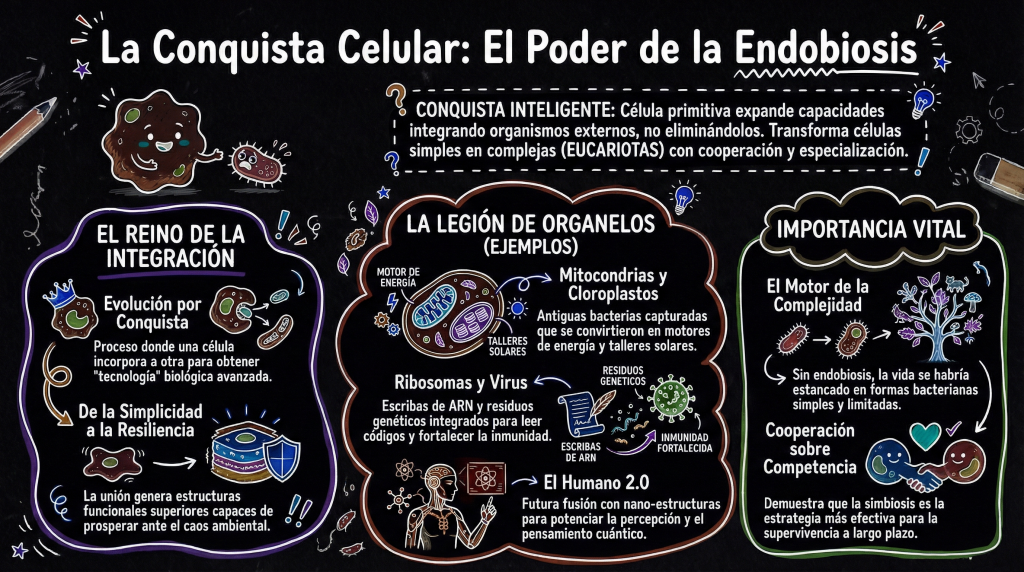 Imagina a la célula primigenia como un reino joven pero limitado. Tenía muros (membranas), pero carecía de una industria energética eficiente. En lugar de desarrollar tecnología propia, este reino expandió sus fronteras mediante la endosimbiosis, un proceso que funciona exactamente como una conquista inteligente.